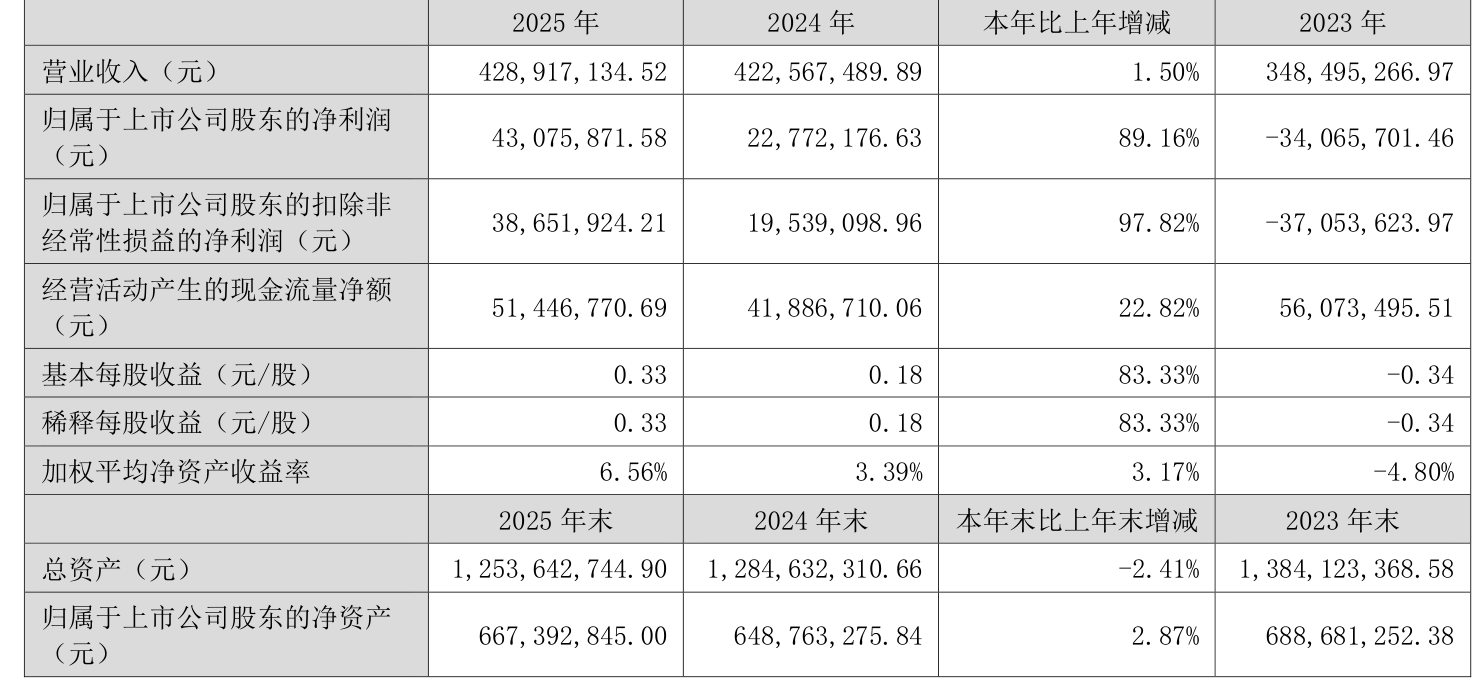 中证智能财讯中晶科技(003026)4月29日披露2025年年度报告。2025年,公司实现营业总收入4.29亿元,同比增长1.50%;归母净利润4307.59万元,同比增长89.16%;扣非净利润3865.19万元,同比增长97.82%;经营活动产生的现金流量净额为5144.68万元,同比增长22.82%;报告期内,中晶科技基本每股收益为0.33元,加权平均净资产收益率为6.56%。公司2025年度分配预案为:拟向全体股东每10股转4.5股,派现2元(含税)。