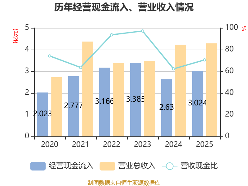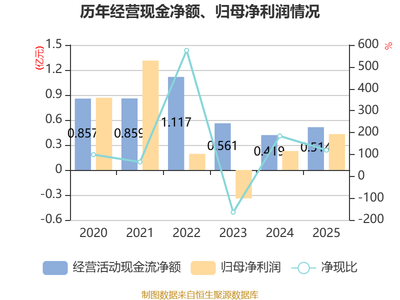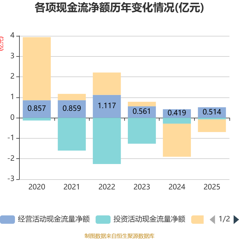 截至2025年,公司经营活动现金流净额为5144.68万元,同比增长22.82%;筹资活动现金流净额-6158.23万元,同比增加9987.34万元;投资活动现金流净额-788.15万元,上年同期为-2861.03万元。