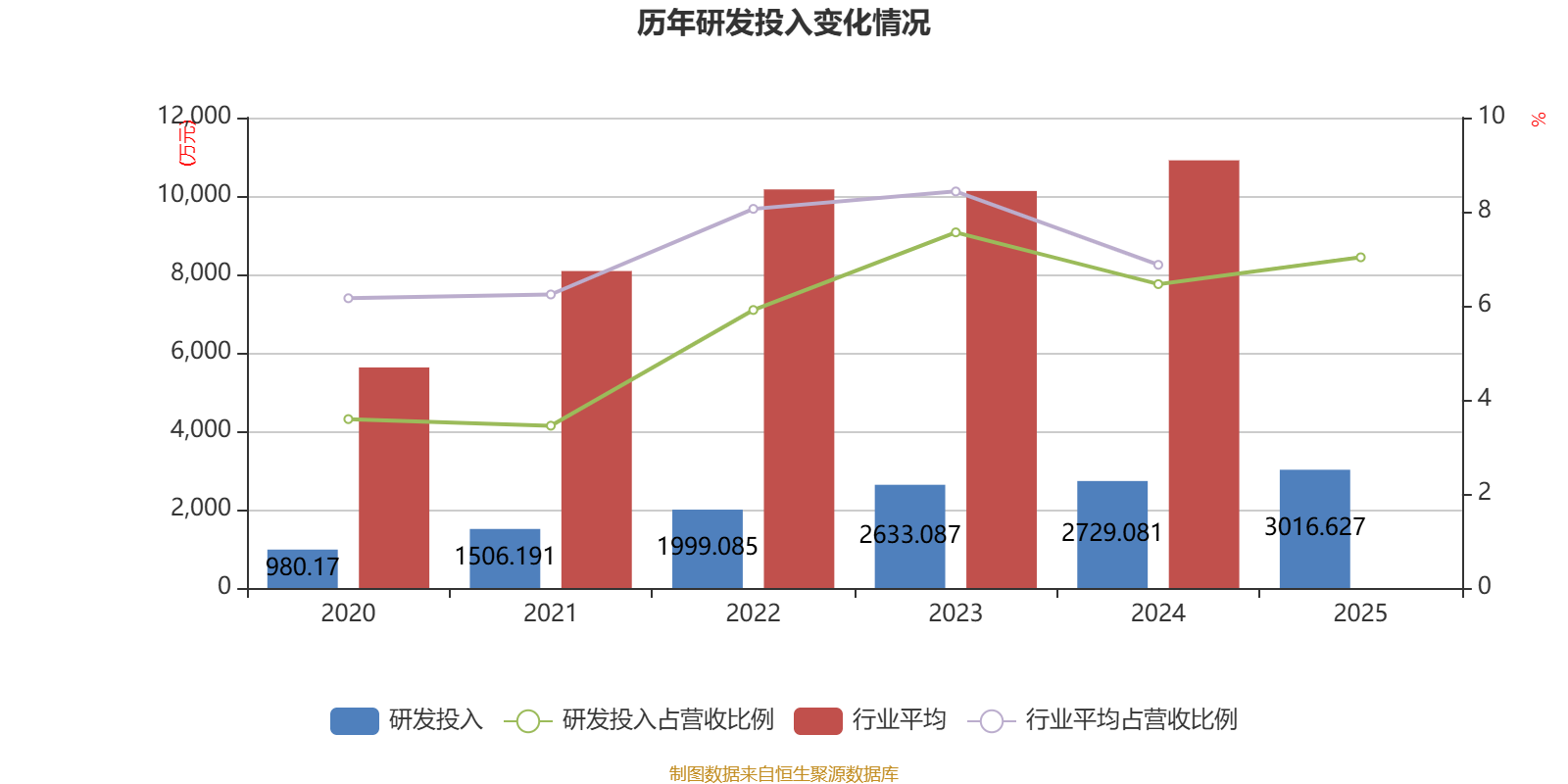 2025年全年,公司研发投入金额为3016.63万元,同比增长10.54%;研发投入占营业收入比例为7.03%,相比上年同期上升0.57个百分点。此外,公司全年研发投入资本化率为0%。