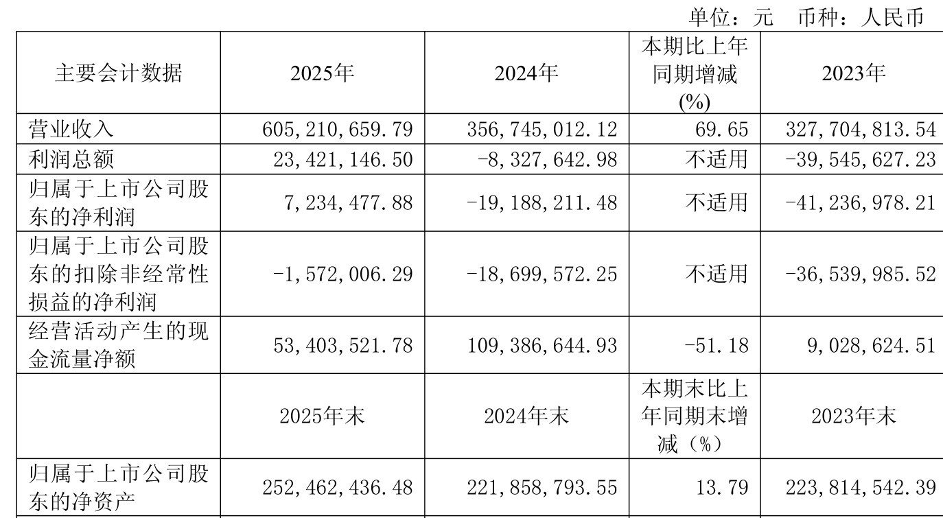 中证智能财讯四川金顶(600678)4月29日披露2025年年度报告。2025年,公司实现营业总收入6.05亿元,同比增长69.65%;归母净利润723.45万元,同比扭亏;扣非净利润亏损157.2万元,上年同期亏损1869.96万元;经营活动产生的现金流量净额为5340.35万元,同比下降51.18%;报告期内,四川金顶基本每股收益为0.0207元,加权平均净资产收益率为3.21%。