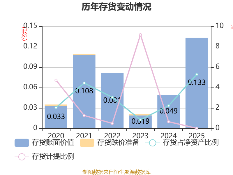 从存货变动来看,截至2025年末,公司存货账面价值为1331.75万元,占净资产的5.28%,较上年末增加840.17万元。公司本期没有计提存货跌价准备。