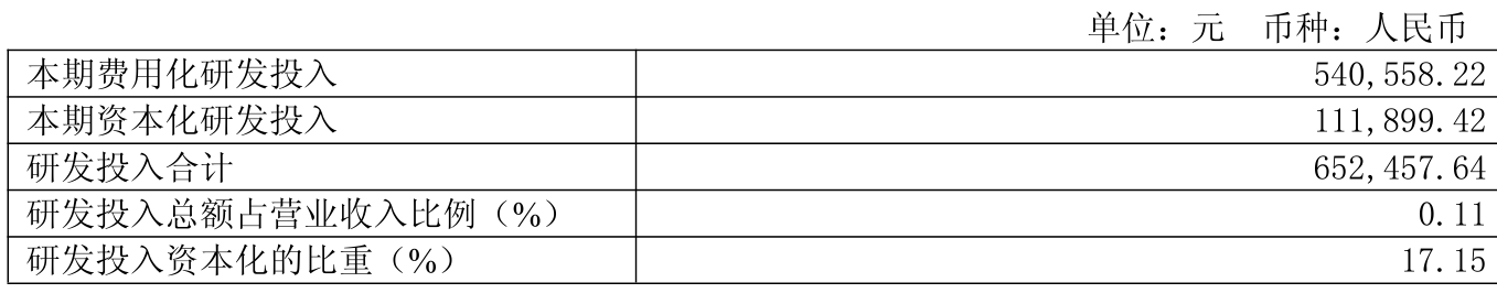 2025年全年,公司研发投入金额为65.25万元,同比下降95.35%;研发投入占营业收入比例为0.11%,相比上年同期下降3.82个百分点。此外,公司全年研发投入资本化率为17.15%。