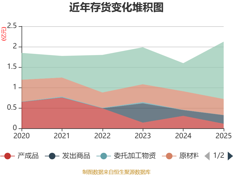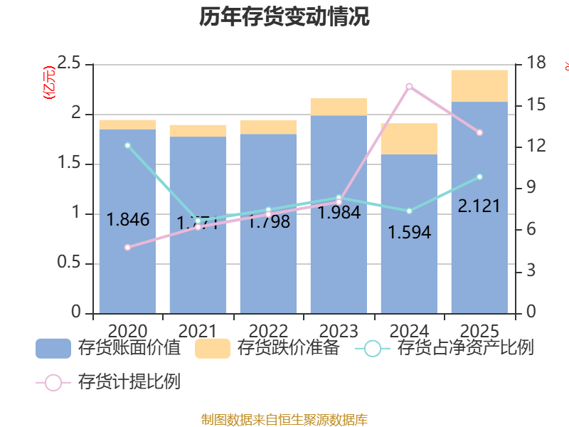 从存货变动来看,截至2025年末,公司存货账面价值为2.12亿元,占净资产的9.85%,较上年末增加5271.11万元。其中,存货跌价准备为3184.02万元,计提比例为13.05%。