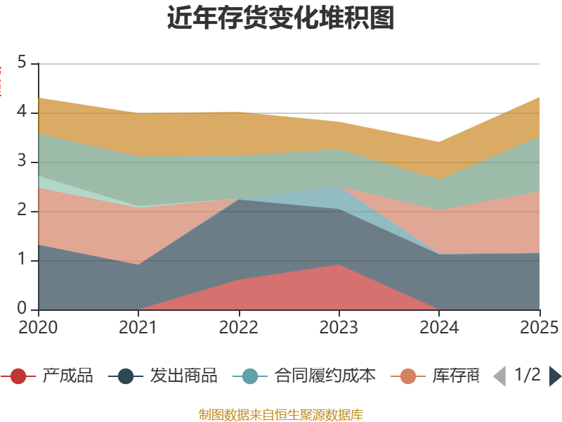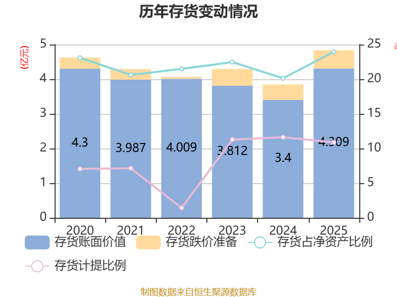 从存货变动来看,截至2025年末,公司存货账面价值为4.31亿元,占净资产的23.96%,较上年末增加9088.74万元。其中,存货跌价准备为5268.05万元,计提比例为10.89%。
