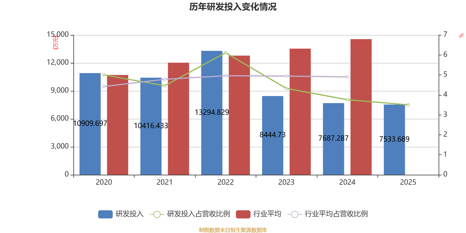 2025年全年,公司研发投入金额为7533.69万元,同比下降2%;研发投入占营业收入比例为3.5%,相比上年同期下降0.26个百分点。此外,公司全年研发投入资本化率为0%。