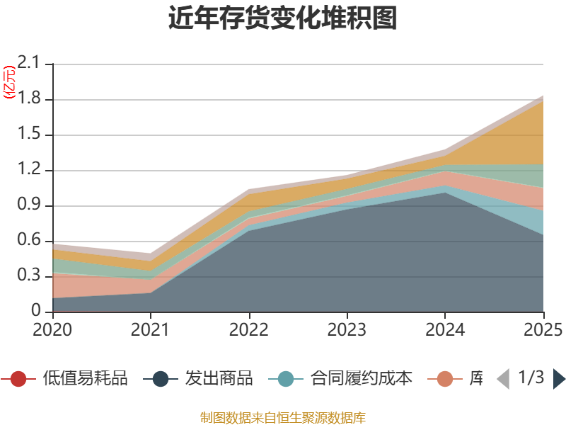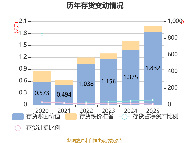从存货变动来看,截至2025年末,公司存货账面价值为1.83亿元,占净资产的58.83%,较上年末增加4573.57万元。其中,存货跌价准备为1647.88万元,计提比例为8.25%。