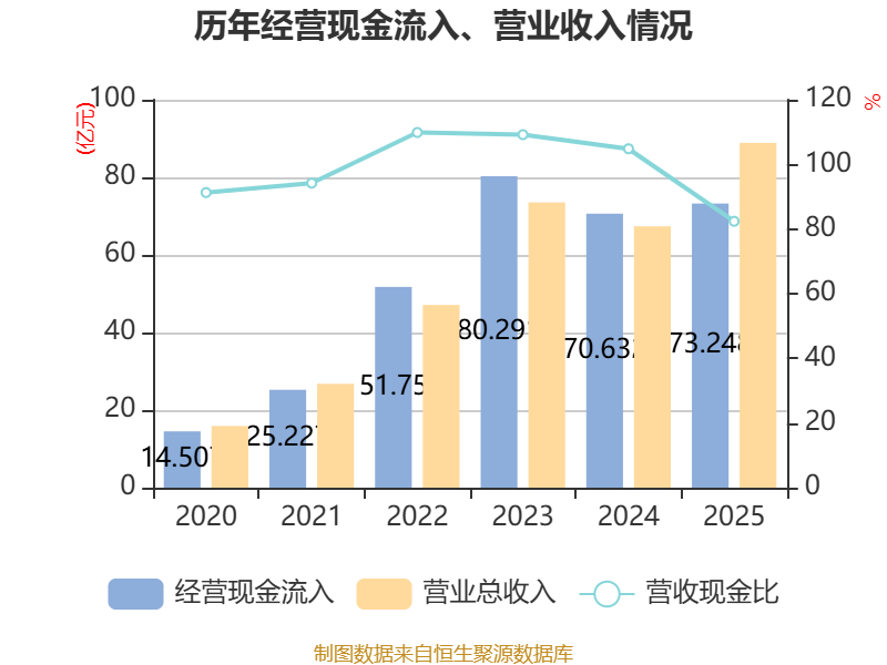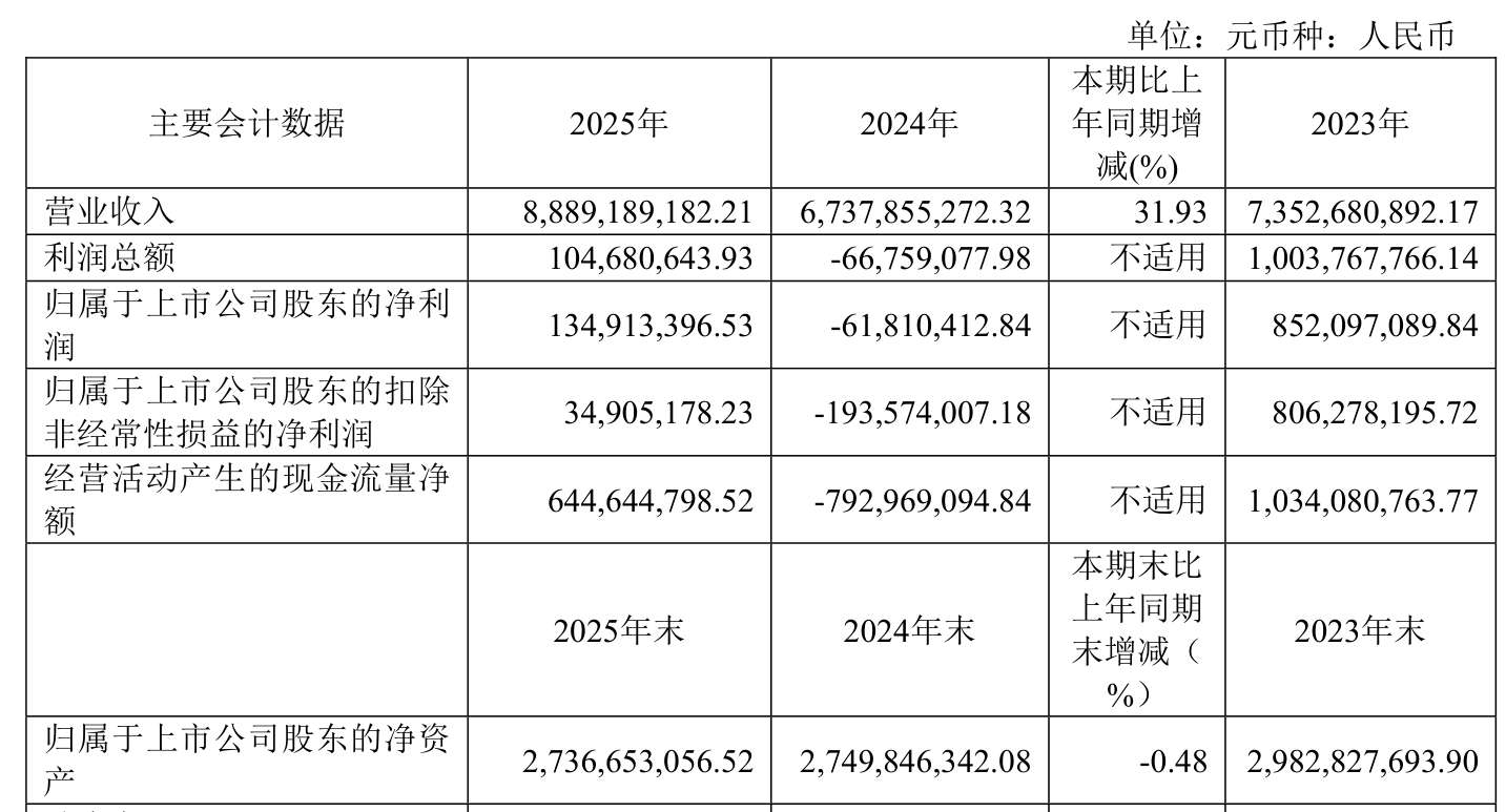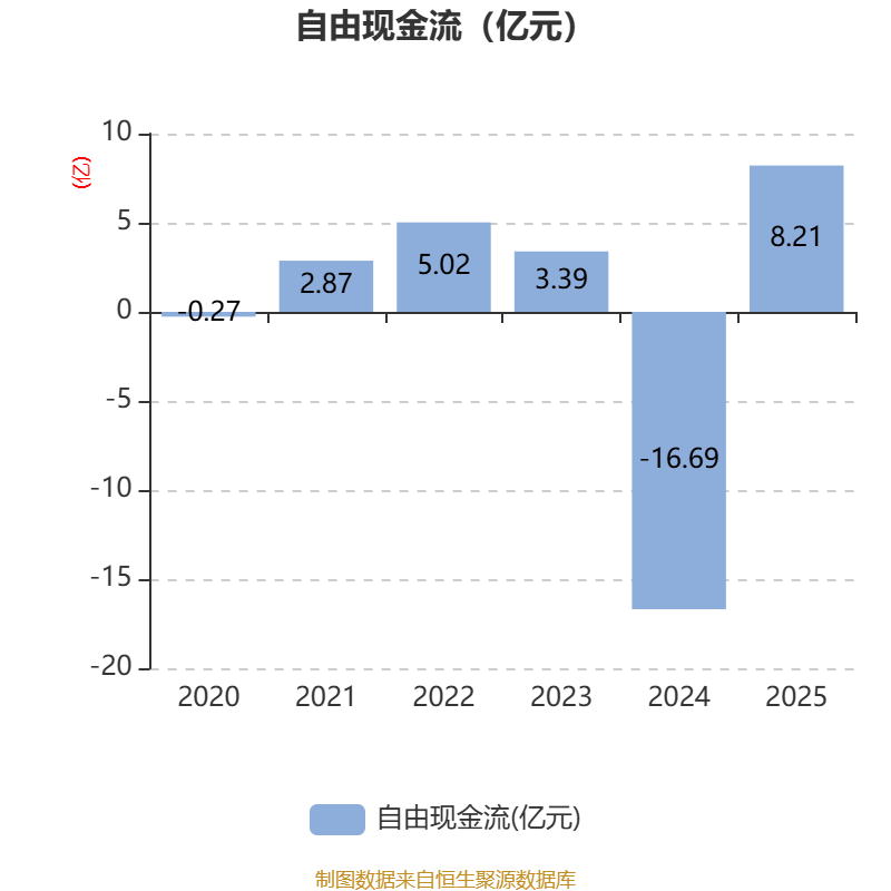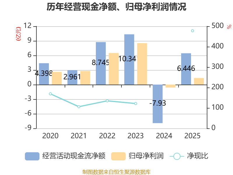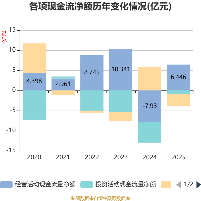 截至2025年,公司经营活动现金流净额为6.45亿元,同比增加14.38亿元;筹资活动现金流净额-3.11亿元,同比减少9亿元;投资活动现金流净额-8458.04万元,上年同期为-5.06亿元。