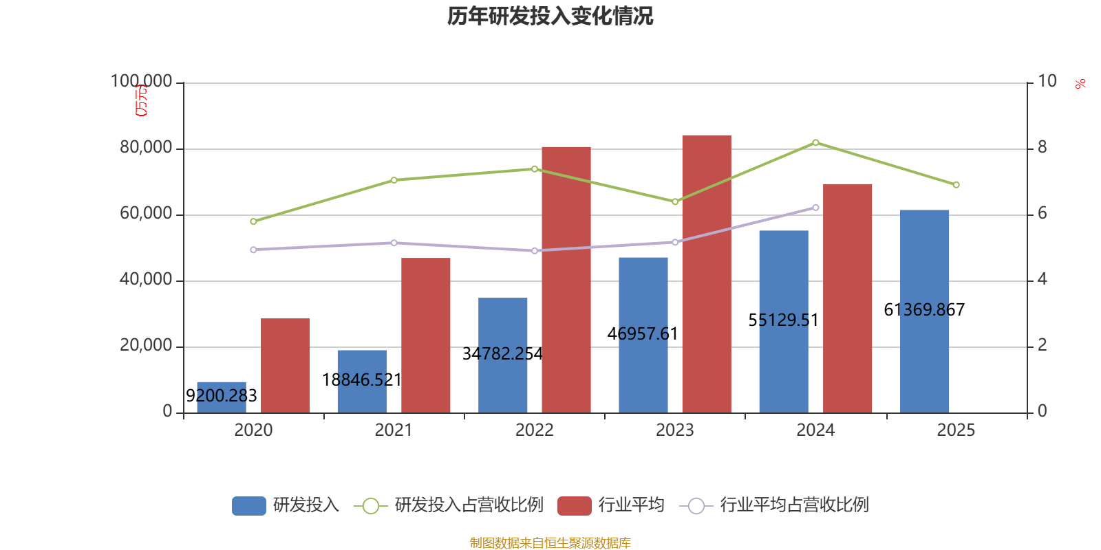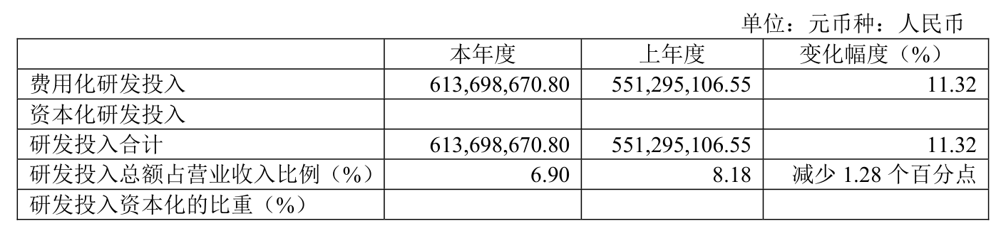 2025年全年,公司研发投入金额为6.14亿元,同比增长11.32%;研发投入占营业收入比例为6.9%,相比上年同期下降1.28个百分点。