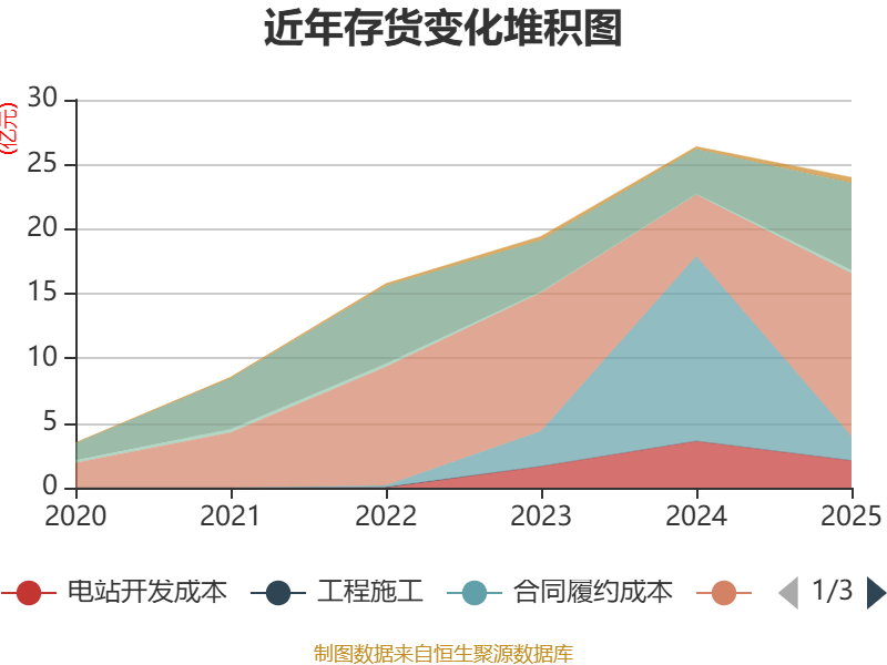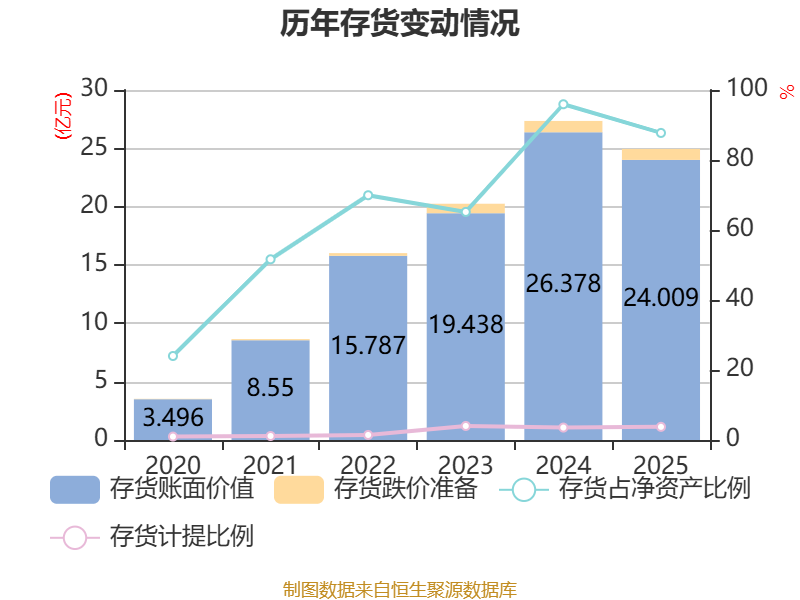 从存货变动来看,截至2025年末,公司存货账面价值为24.01亿元,占净资产的87.73%,较上年末减少2.37亿元。其中,存货跌价准备为9372.28万元,计提比例为3.76%。