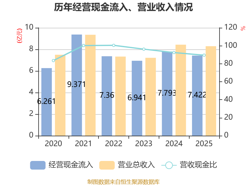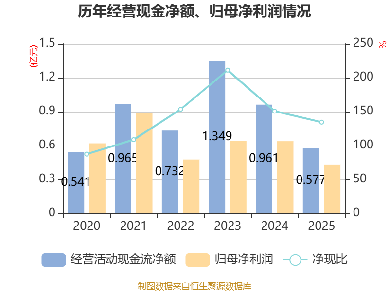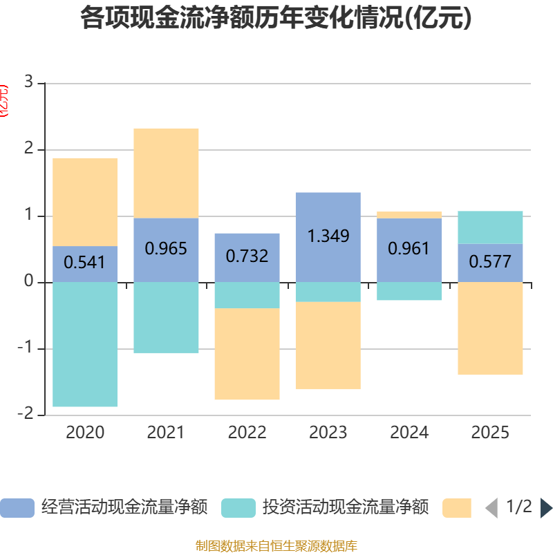 截至2025年,公司经营活动现金流净额为5768.95万元,同比下降39.97%;筹资活动现金流净额-1.4亿元,同比减少1.5亿元;投资活动现金流净额4921.86万元,上年同期为-2735.97万元。