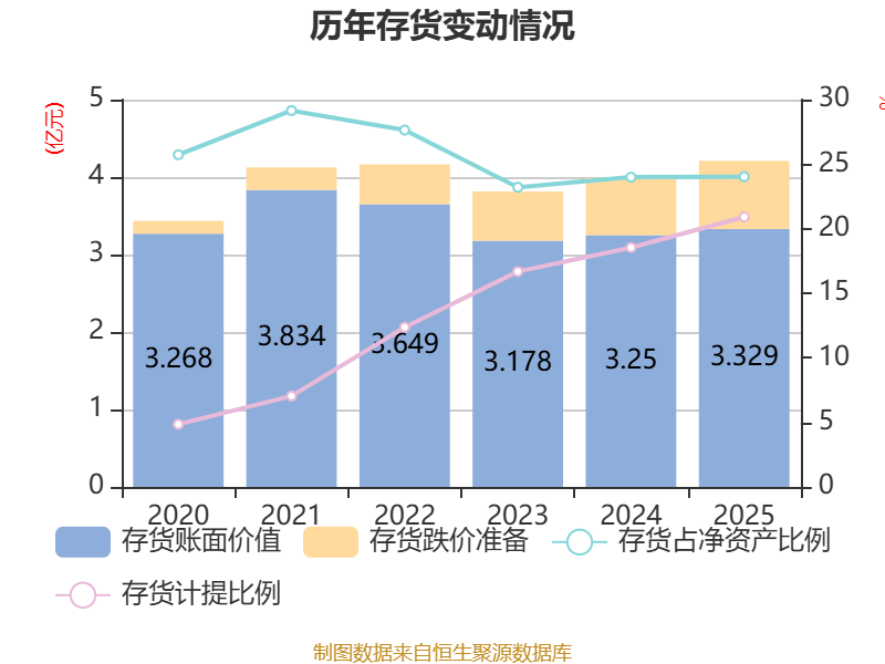从存货变动来看,截至2025年末,公司存货账面价值为3.33亿元,占净资产的24.03%,较上年末增加791.52万元。其中,存货跌价准备为8801.19万元,计提比例为20.91%。