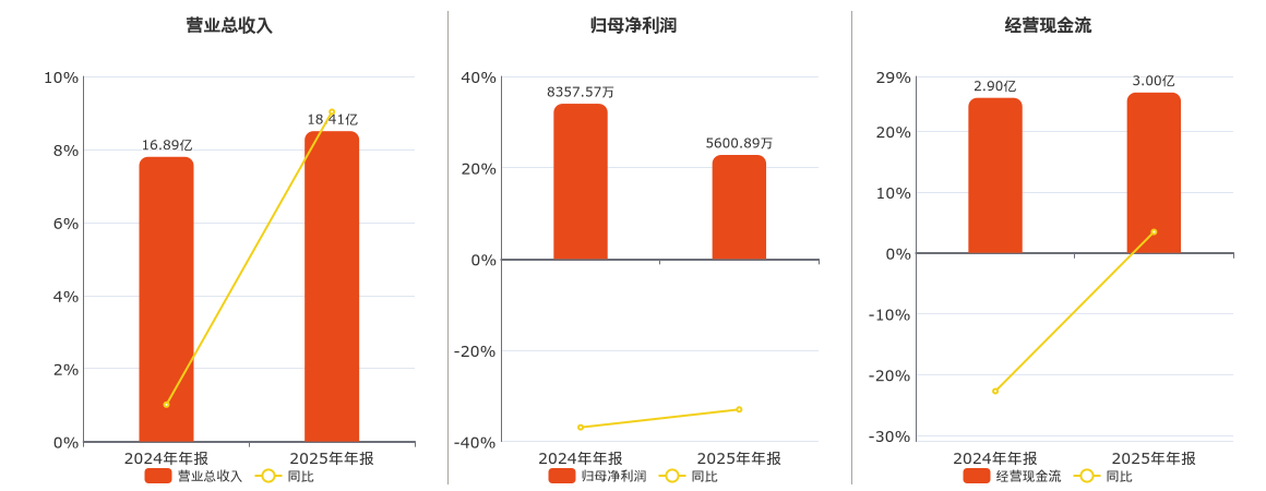 公司营业总收入为18.41亿元,在已披露的同业公司中排名第14。归母净利润为5600.89万元,在已披露的同业公司中排名第15,较去年同报告期归母净利润减少1437.79万元,同比较去年同期下降20.43%。经营活动现金净流入为3.00亿元。