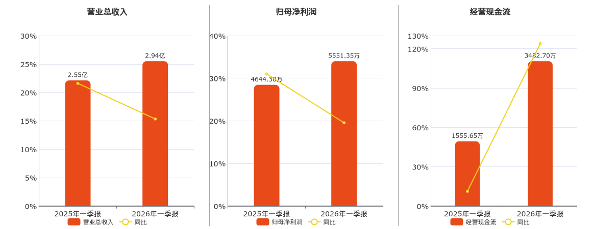 公司营业总收入为2.94亿元,在已披露的同业公司中排名第73。归母净利润为5551.35万元。经营活动现金净流入为3482.70万元。