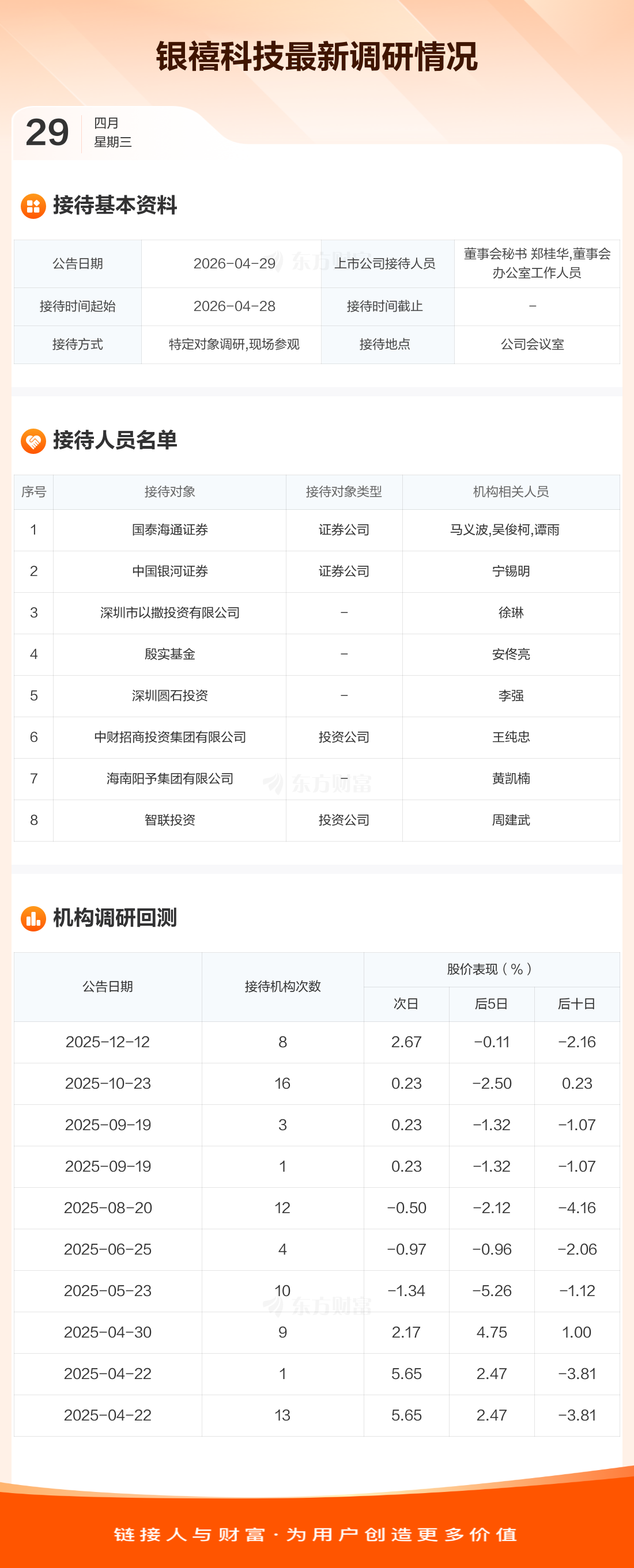 银禧科技4月29日公告称,4月28日接待国泰海通证券等8家机构调研。接待人员包括董事会秘书 郑桂华,董事会办公室工作人员。