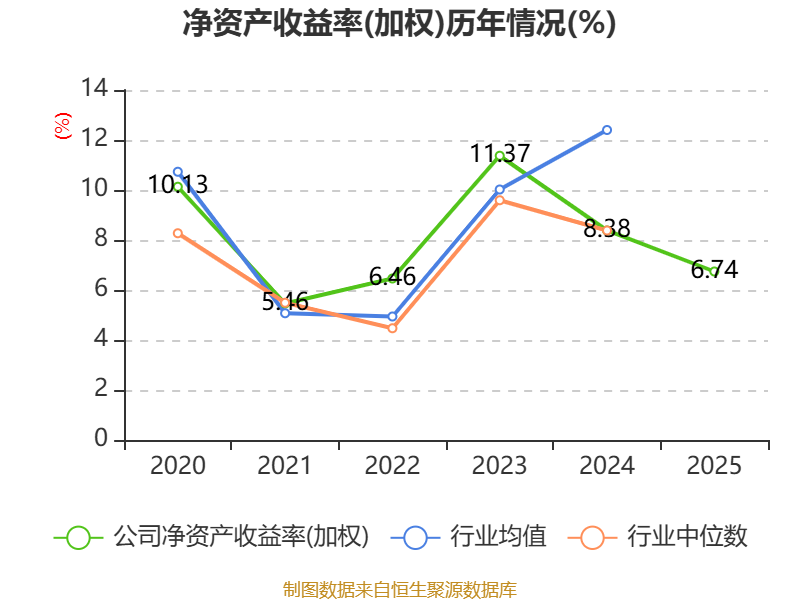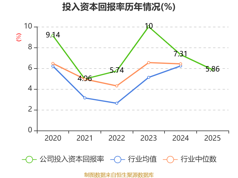 数据显示,2025年公司加权平均净资产收益率为6.74%,较上年同期下降1.64个百分点。公司2025年投入资本回报率为5.86%,较上年同期下降1.45个百分点。
