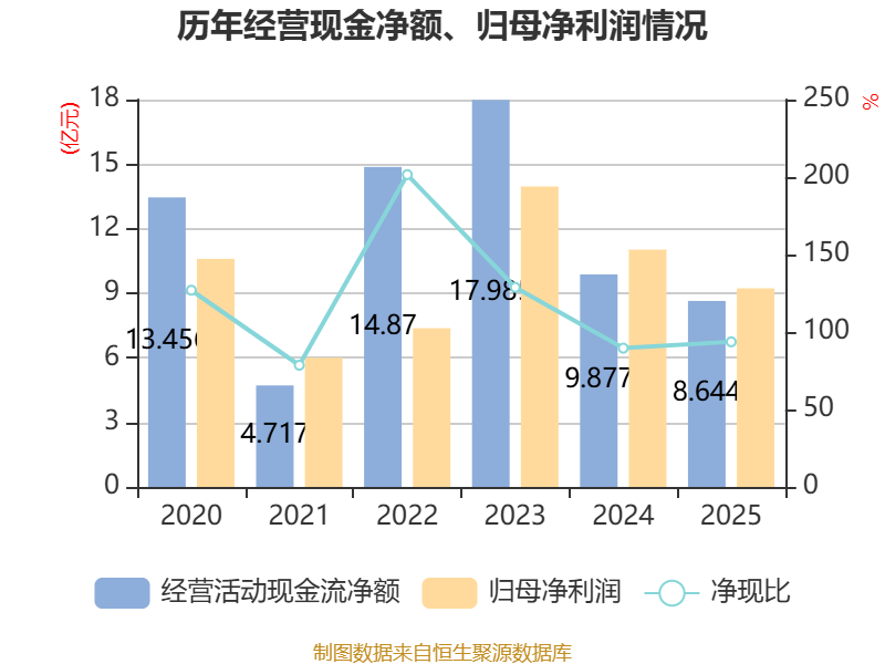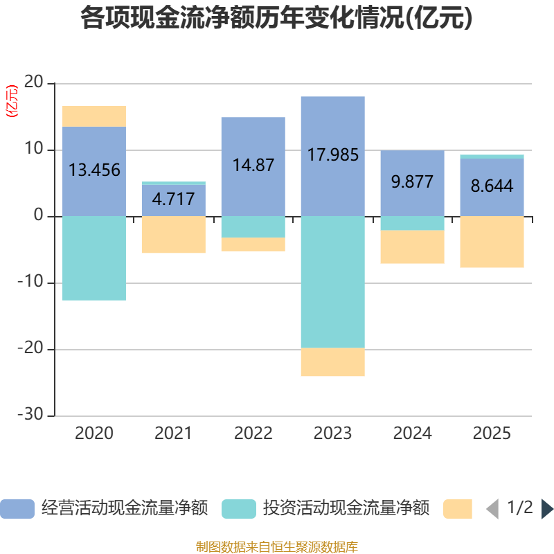 截至2025年,公司经营活动现金流净额为8.64亿元,同比下降12.49%;筹资活动现金流净额-7.75亿元,同比减少2.77亿元;投资活动现金流净额5862.57万元,上年同期为-2.16亿元。