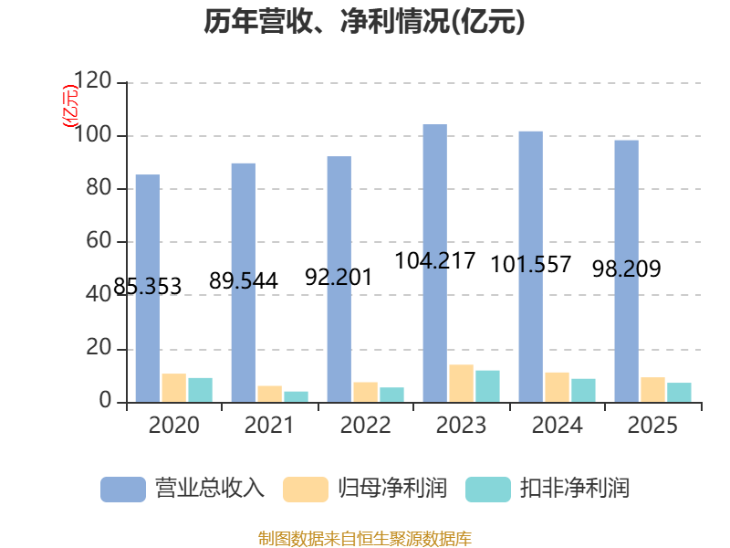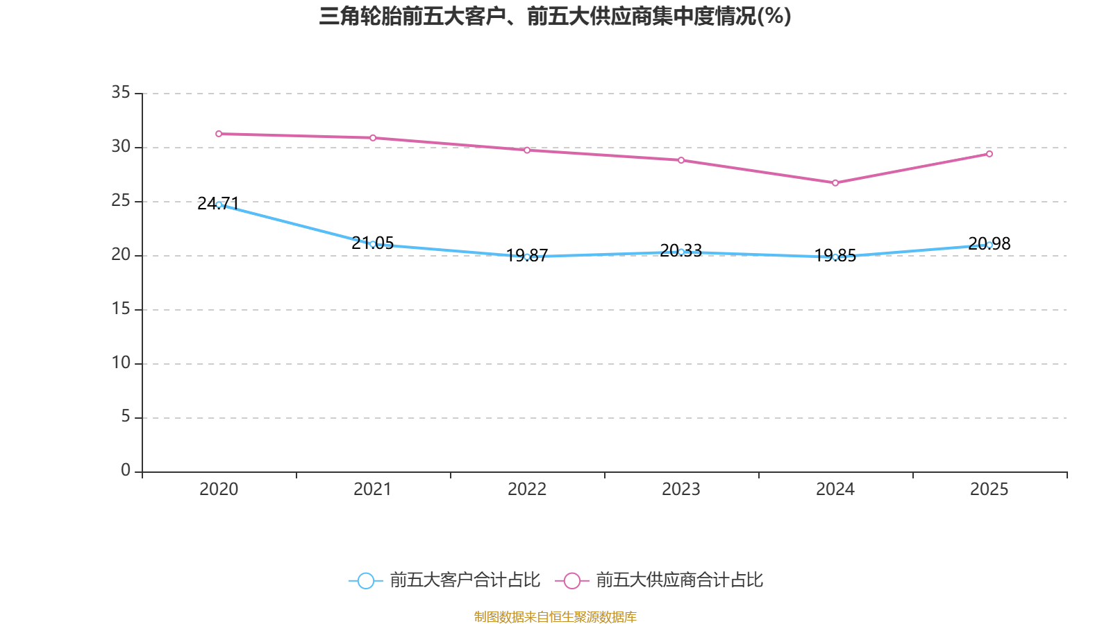 中证智能财讯三角轮胎(601163)4月29日披露2025年年度报告。2025年,公司实现营业总收入98.21亿元,同比下降3.30%;归母净利润9.23亿元,同比下降16.30%;扣非净利润7.18亿元,同比下降17.06%;经营活动产生的现金流量净额为8.64亿元,同比下降12.49%;报告期内,三角轮胎基本每股收益为1.15元,加权平均净资产收益率为6.74%。公司2025年度分配预案为:拟向全体股东每10股派现4元(含税)。