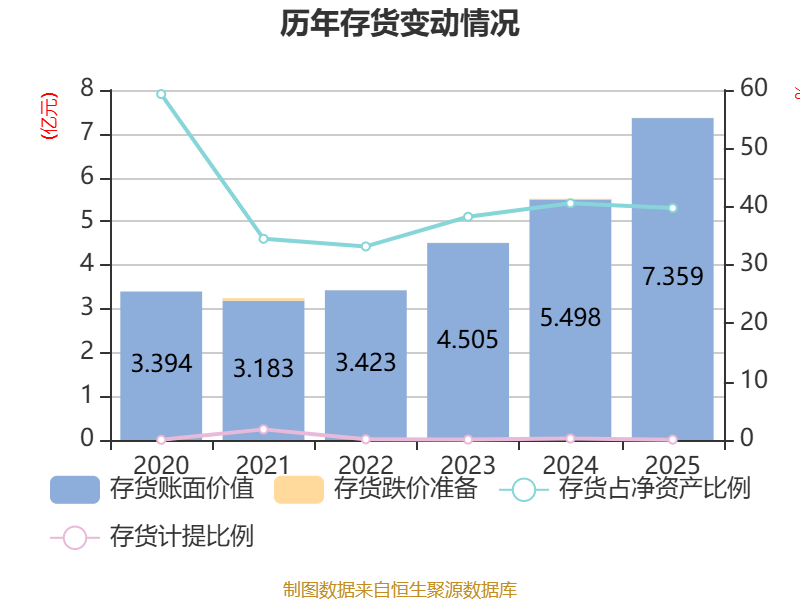 从存货变动来看,截至2025年末,公司存货账面价值为7.36亿元,占净资产的39.76%,较上年末增加1.86亿元。其中,存货跌价准备为45.97万元,计提比例为0.06%。