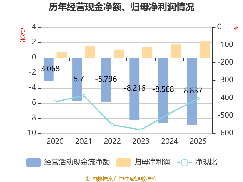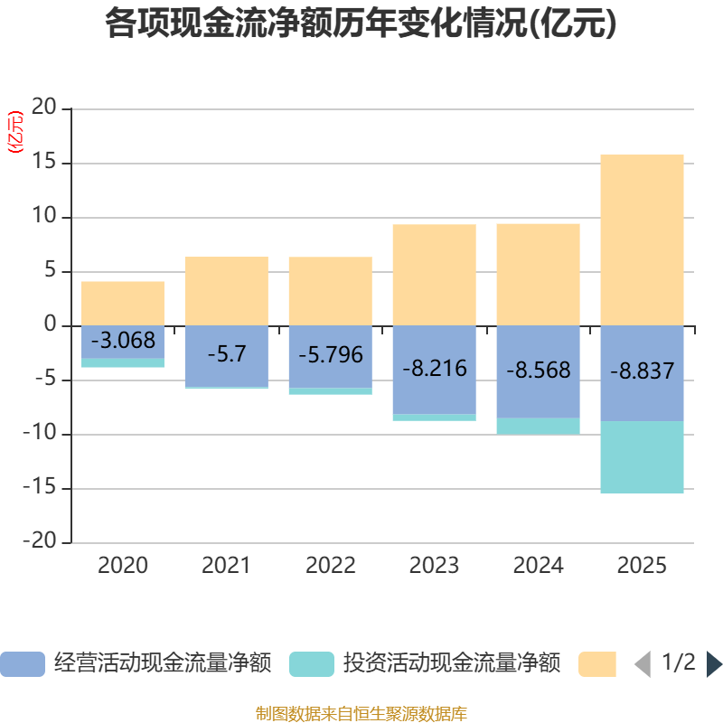 截至2025年,公司经营活动现金流净额为-8.84亿元,同比减少2688.54万元;筹资活动现金流净额15.75亿元,同比增加6.39亿元;投资活动现金流净额-6.67亿元,上年同期为-1.47亿元。