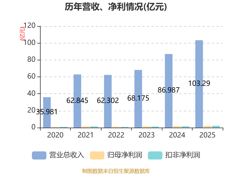 中证智能财讯江南新材(603124)4月29日披露2025年年度报告。2025年,公司实现营业总收入103.29亿元,同比增长18.74%;归母净利润2.19亿元,同比增长24.28%;扣非净利润2.18亿元,同比增长40.35%;经营活动产生的现金流量净额为-8.84亿元,上年同期为-8.57亿元;报告期内,江南新材基本每股收益为1.6元,加权平均净资产收益率为13.00%。公司2025年度分配预案为:拟向全体股东每10股派现4.6元(含税)。