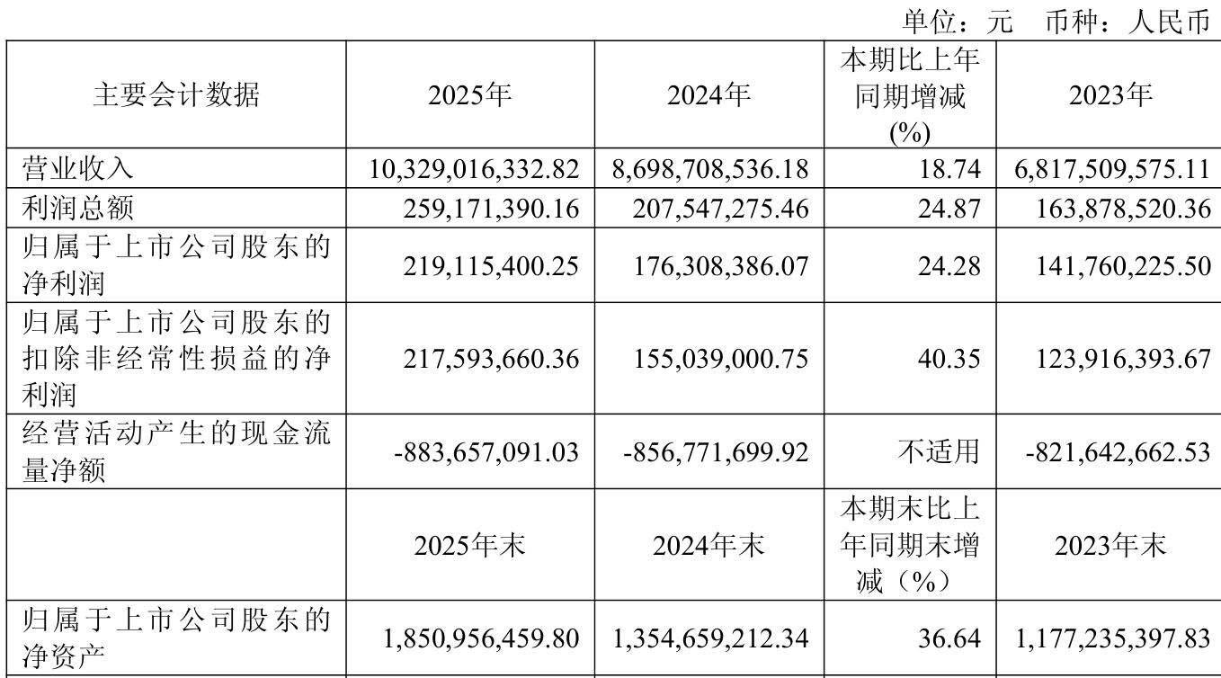 资产重大变化方面,截至2025年末,公司应收票据及应收账款较上年末增加25.69%,占公司总资产比重下降3.41个百分点;货币资金较上年末增加56.71%,占公司总资产比重上升3.38个百分点;其他非流动资产较上年末增加1093.31%,占公司总资产比重上升1.37个百分点;固定资产较上年末增加10.53%,占公司总资产比重下降1.06个百分点。