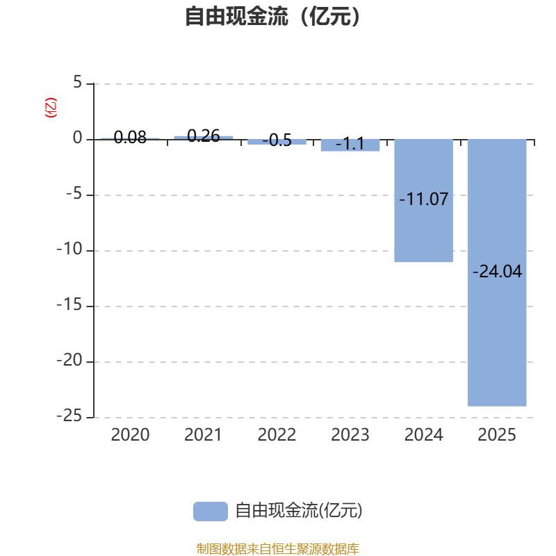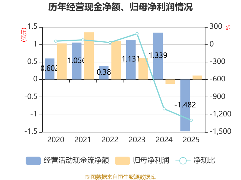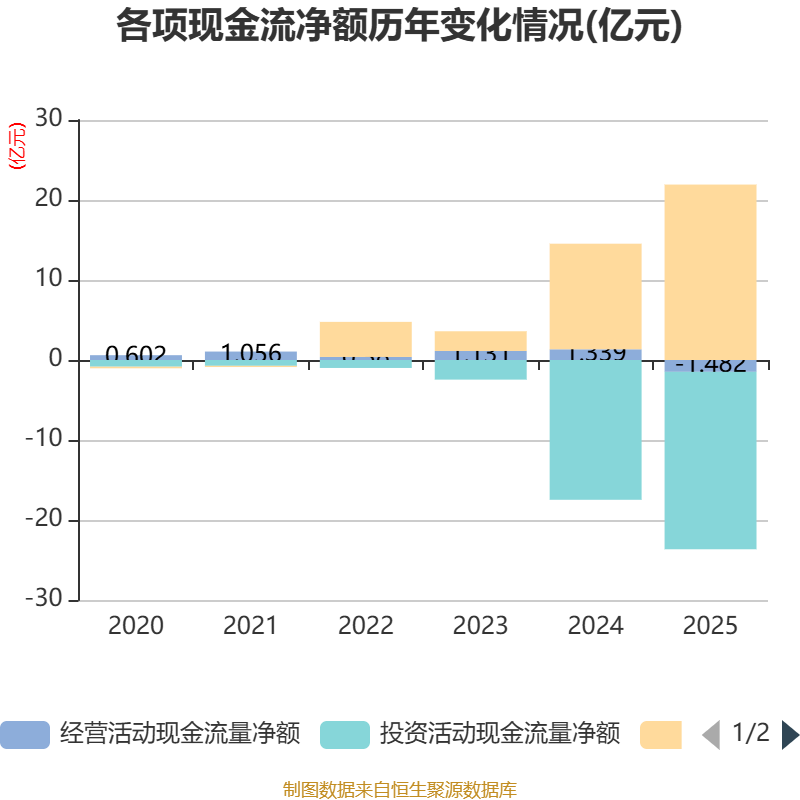 截至2025年,公司经营活动现金流净额为-1.48亿元,同比减少2.82亿元;筹资活动现金流净额21.93亿元,同比增加8.73亿元;投资活动现金流净额-22.18亿元,上年同期为-17.47亿元。