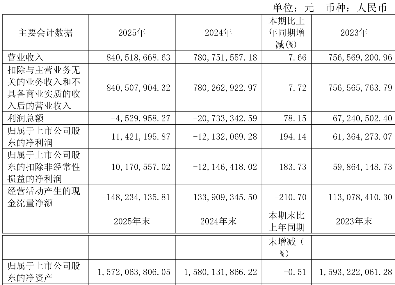 中证智能财讯鼎际得(603255)4月29日披露2025年年度报告。2025年,公司实现营业总收入8.41亿元,同比增长7.66%;归母净利润1142.12万元,同比扭亏;扣非净利润1017.06万元,同比扭亏;经营活动产生的现金流量净额为-1.48亿元,上年同期为1.34亿元;报告期内,鼎际得基本每股收益为0.08元,加权平均净资产收益率为0.72%。公司2025年度分配预案为:拟向全体股东每10股派现0.35元(含税)。
