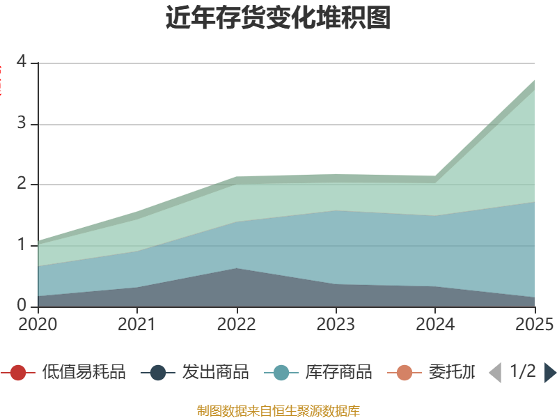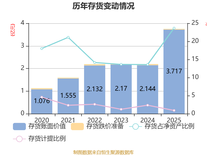 从存货变动来看,截至2025年末,公司存货账面价值为3.72亿元,占净资产的23.64%,较上年末增加1.57亿元。其中,存货跌价准备为333.49万元,计提比例为0.89%。