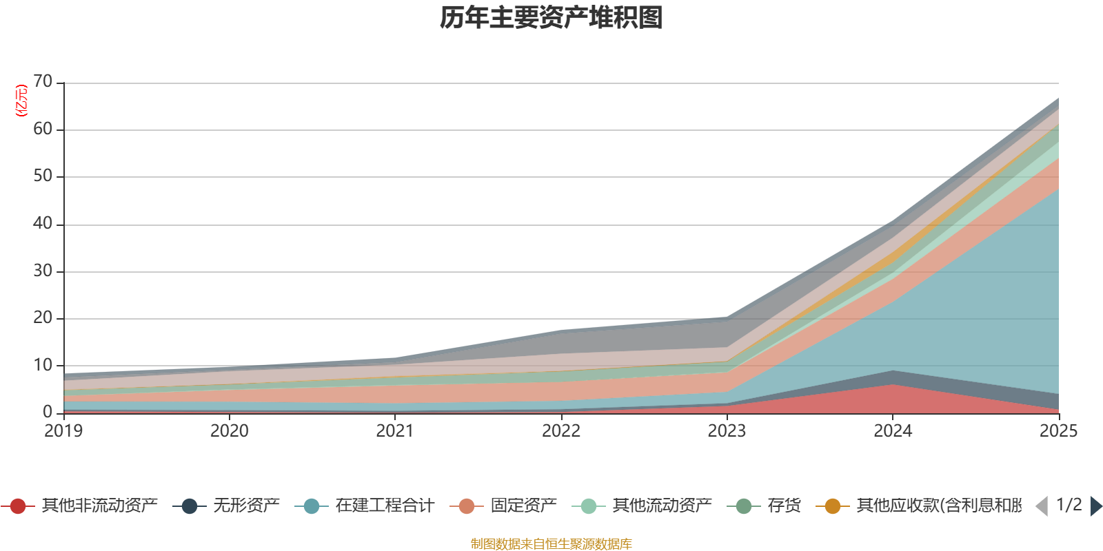 资产重大变化方面,截至2025年末,公司在建工程合计较上年末增加199.36%,占公司总资产比重上升29.47个百分点;其他非流动资产较上年末减少87.55%,占公司总资产比重下降13.78个百分点;其他应收款(含利息和股利)较上年末减少96.78%,占公司总资产比重下降5.31个百分点;货币资金较上年末减少70.5%,占公司总资产比重下降4.93个百分点。