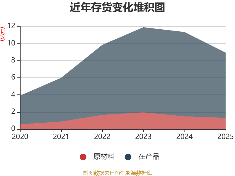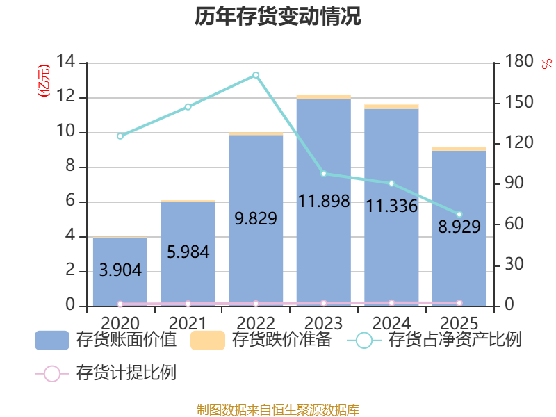 从存货变动来看,截至2025年末,公司存货账面价值为8.93亿元,占净资产的67.68%,较上年末减少2.41亿元。其中,存货跌价准备为1894.67万元,计提比例为2.08%。