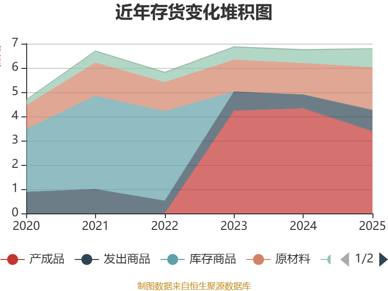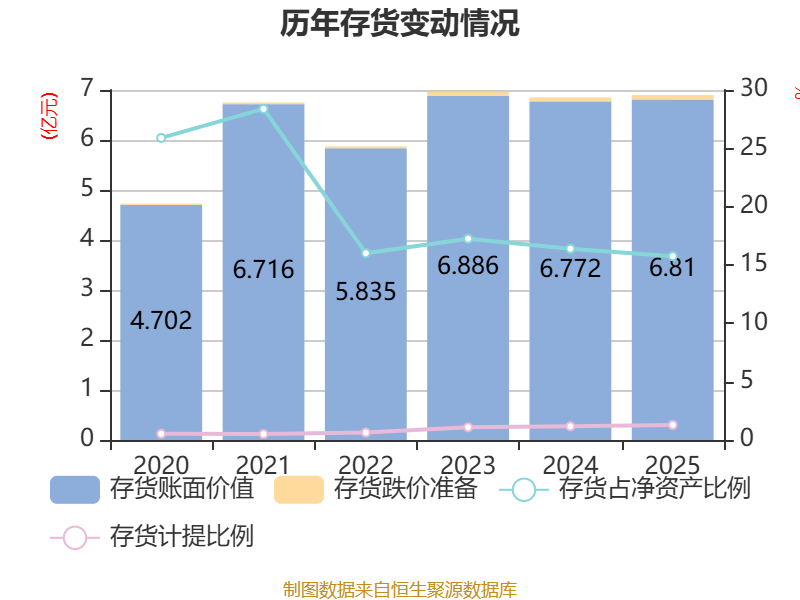 从存货变动来看,截至2025年末,公司存货账面价值为6.81亿元,占净资产的15.76%,较上年末增加383.15万元。其中,存货跌价准备为888.07万元,计提比例为1.29%。