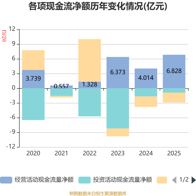 截至2025年,公司经营活动现金流净额为6.83亿元,同比增长70.12%;筹资活动现金流净额-1.99亿元,同比增加1576.02万元;投资活动现金流净额-9080.49万元,上年同期为-1.67亿元。