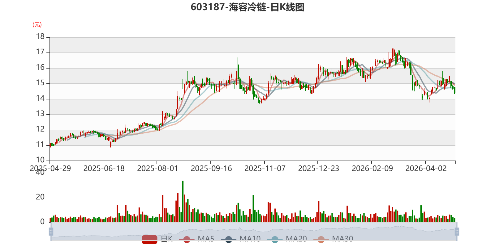 以4月28日收盘价计算,海容冷链目前市盈率(TTM)约为14.3倍,市净率(LF)约1.29倍,市销率(TTM)约1.66倍。