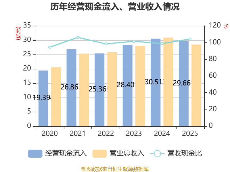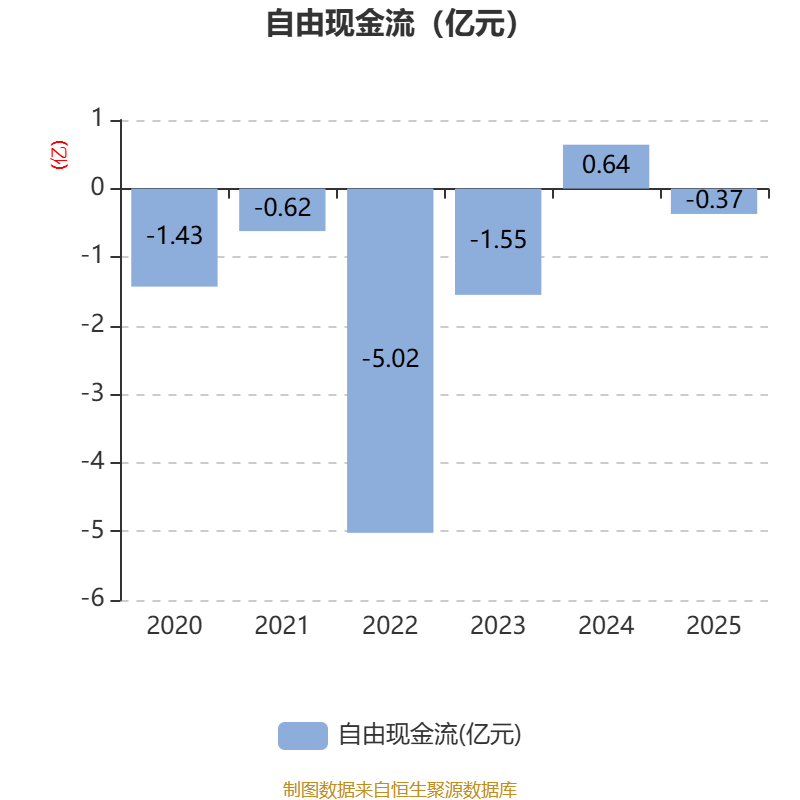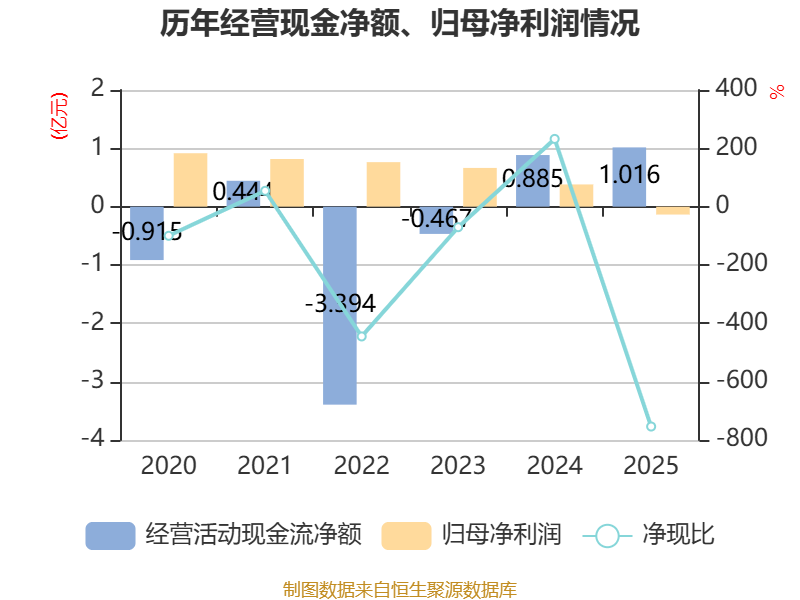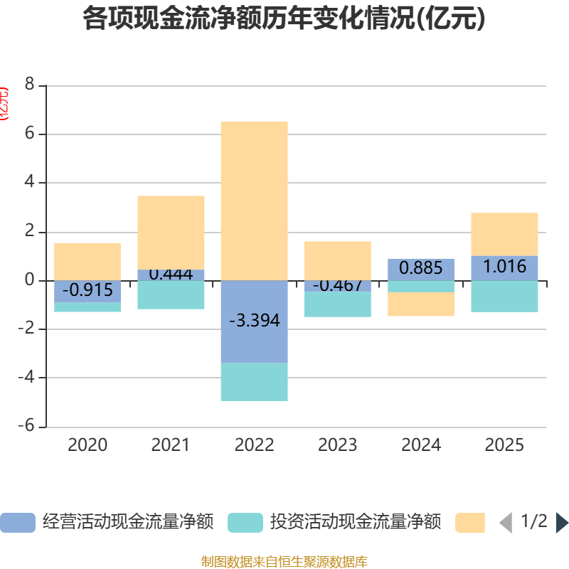 截至2025年,公司经营活动现金流净额为1.02亿元,同比增长14.73%;筹资活动现金流净额1.76亿元,同比增加2.74亿元;投资活动现金流净额-1.3亿元,上年同期为-4846.98万元。