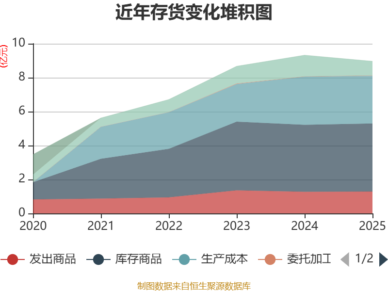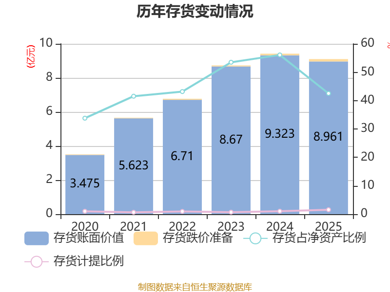从存货变动来看,截至2025年末,公司存货账面价值为8.96亿元,占净资产的42.52%,较上年末减少3617.81万元。其中,存货跌价准备为1424.5万元,计提比例为1.56%。