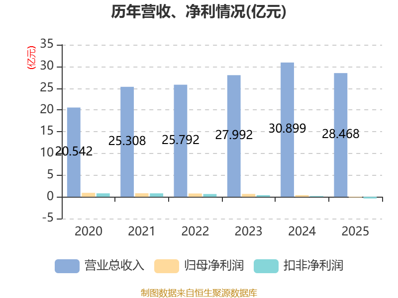 中证智能财讯中辰股份(300933)4月29日披露2025年年度报告。2025年,公司实现营业总收入28.47亿元,同比下降7.87%;归母净利润亏损1347.7万元,上年同期盈利3812.14万元;扣非净利润亏损3887.64万元,上年同期盈利1754.29万元;经营活动产生的现金流量净额为1.02亿元,同比增长14.73%;报告期内,中辰股份基本每股收益为-0.03元,加权平均净资产收益率为-0.77%。
