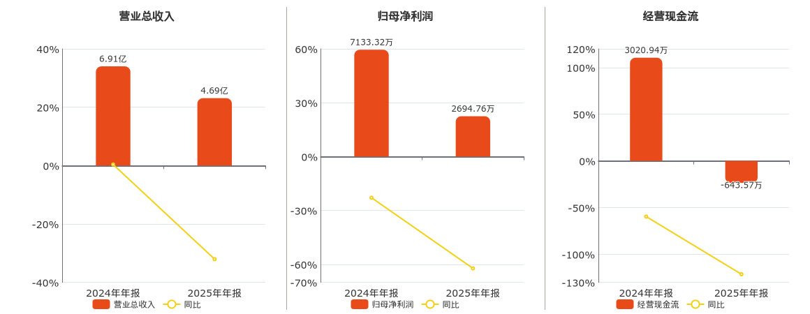 公司营业总收入为4.69亿元,在已披露的同业公司中排名第64,较去年同报告期营业总收入减少2.21亿元,同比较去年同期下降32.06%。归母净利润为2694.76万元,在已披露的同业公司中排名第50,较去年同报告期归母净利润减少4438.56万元,同比较去年同期下降62.22%。经营活动现金净流入为-643.57万元,在已披露的同业公司中排名第67,较去年同报告期经营活动现金净流入减少3664.51万元,同比较去年同期下降121.30%。
