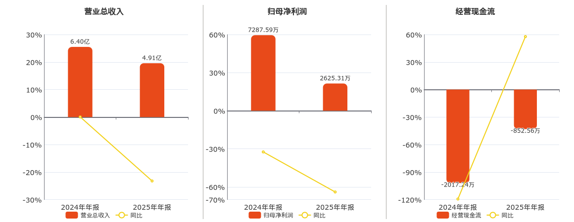 公司营业总收入为4.91亿元,在已披露的同业公司中排名第63,较去年同报告期营业总收入减少1.49亿元,同比较去年同期下降23.22%。归母净利润为2625.31万元,在已披露的同业公司中排名第51,较去年同报告期归母净利润减少4662.28万元,同比较去年同期下降63.98%。经营活动现金净流入为-852.56万元,在已披露的同业公司中排名第68。