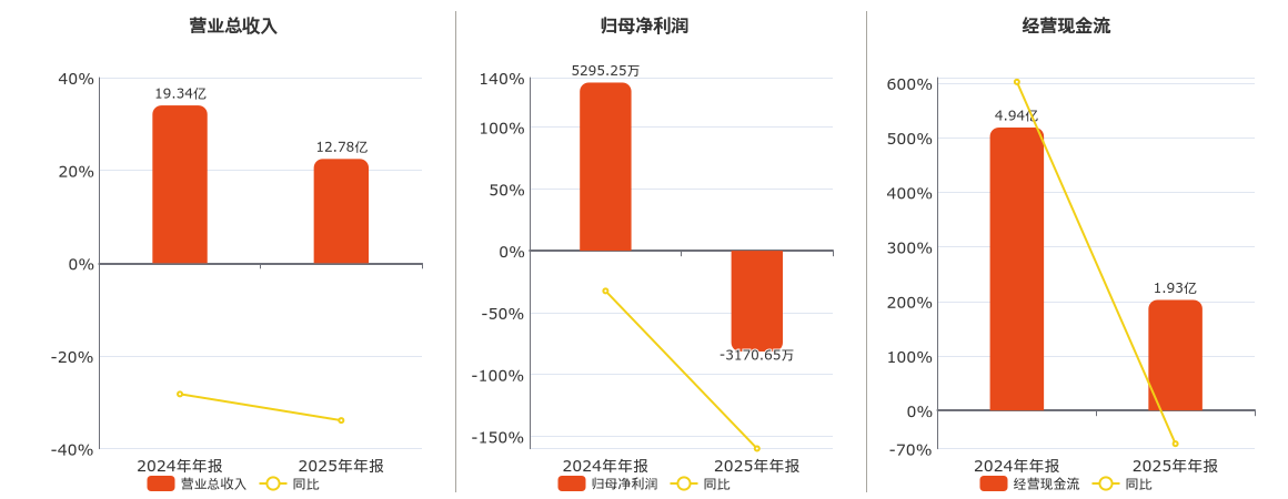 公司营业总收入为12.78亿元,在已披露的同业公司中排名第24,较去年同报告期营业总收入减少6.54亿元,同比较去年同期下降33.85%。归母净利润为-3170.65万元,在已披露的同业公司中排名第23,较去年同报告期归母净利润减少9689.15万元,同比较去年同期下降148.64%。经营活动现金净流入为1.93亿元,较去年同报告期经营活动现金净流入减少3.01亿元,同比较去年同期下降60.93%。