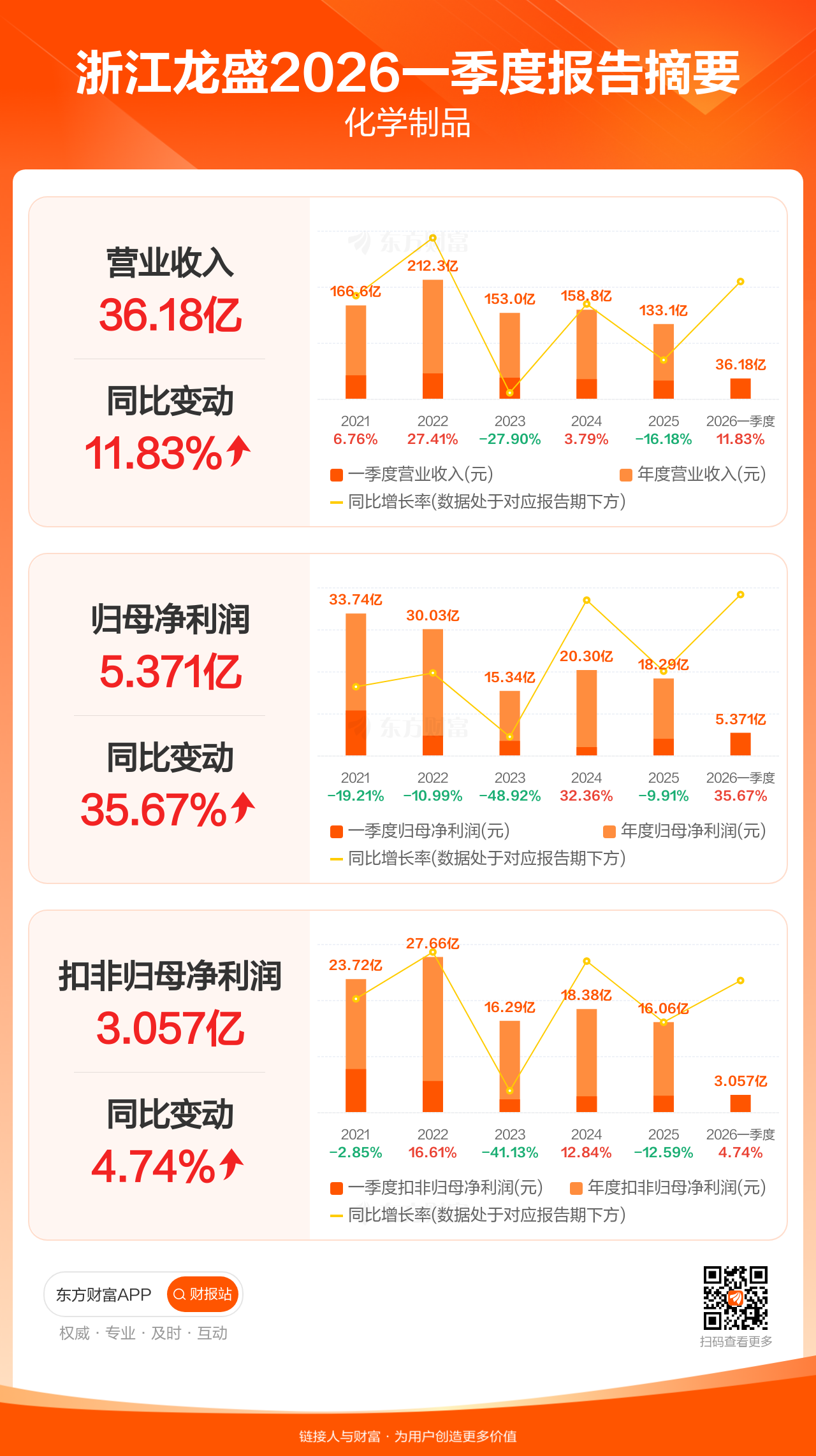 浙江龙盛4月28日发布2026年一季报显示,公司一季度实现营业收入36.18亿元,同比增长11.83%;归母净利润5.37亿元,同比增长35.67%;扣非归母净利润3.06亿元,同比增长4.74%。