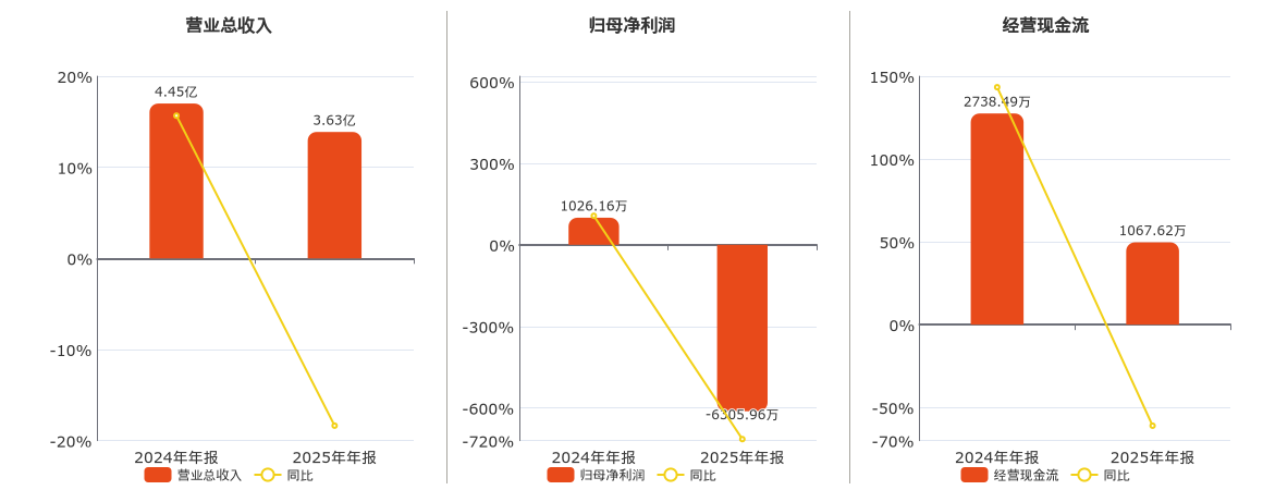 公司营业总收入为3.63亿元,在已披露的同业公司中排名第13,较去年同报告期营业总收入减少8170.67万元,同比较去年同期下降18.36%。归母净利润为-6305.96万元,在已披露的同业公司中排名第13,较去年同报告期归母净利润减少7332.12万元,同比较去年同期下降714.52%。经营活动现金净流入为1067.62万元,在已披露的同业公司中排名第12,较去年同报告期经营活动现金净流入减少1670.87万元,同比较去年同期下降61.01%。