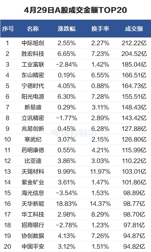 沪深两市成交额2.59万亿元,较上一交易日放量538亿元。个股方面,中际旭创当日成交212.22亿元。胜宏科技当日成交204.52亿元。