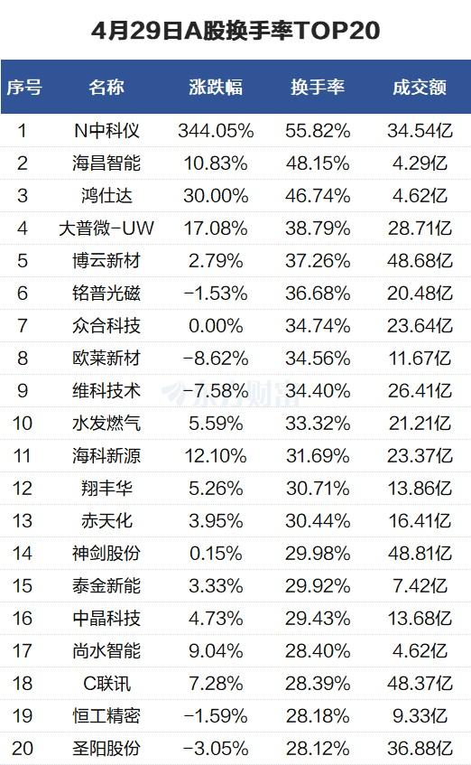 当天换手率最高的个股为N中科仪,全天换手率55.82%。海昌智能紧随其后,全天换手率48.15%。
