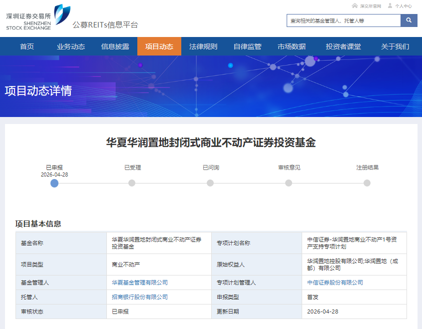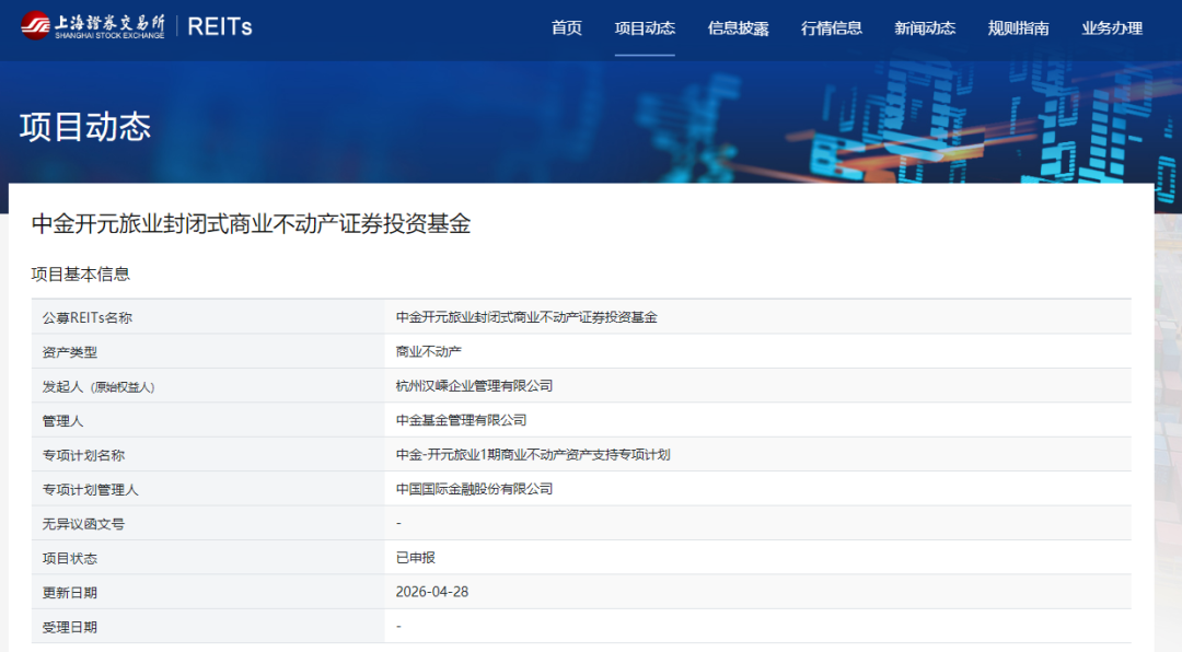 4月28日,证监会官网显示,华夏华润置地商业不动产REIT和中金开元旅业商业不动产REIT正式申报,并于当日接收材料。