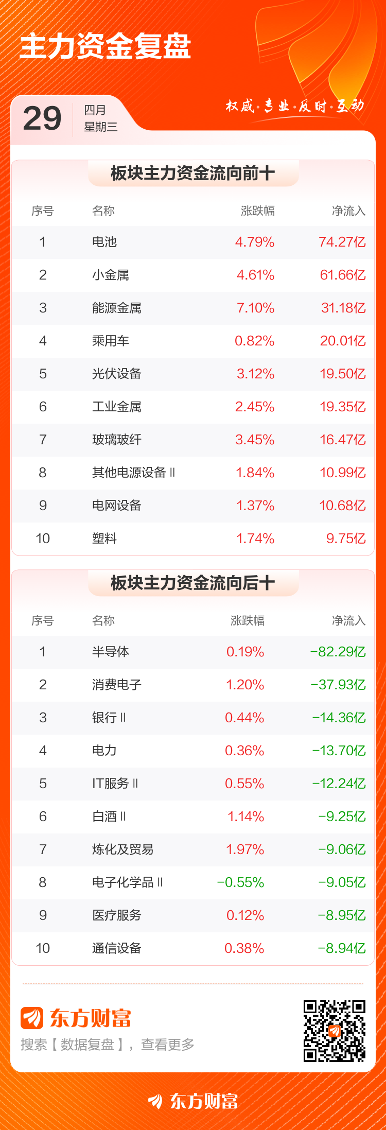 4月29日,沪指涨0.71%,深成指涨1.96%,创业板指涨2.52%。两市成交额2.59万亿,较上个交易日放量538亿。数据显示,今日大盘主力资金净流入153.82亿。电池、小金属、能源金属等板块主力资金流入排名居前,其中电池净流入74.27亿元。
