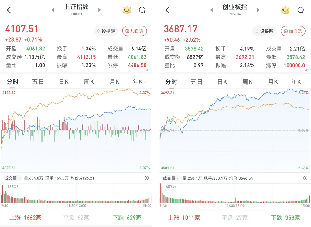 至收盘,上证综指涨0.71%,报4107.51点;深证成指涨1.96%,报15120.92点;创业板指涨2.51%,报3687.17点。