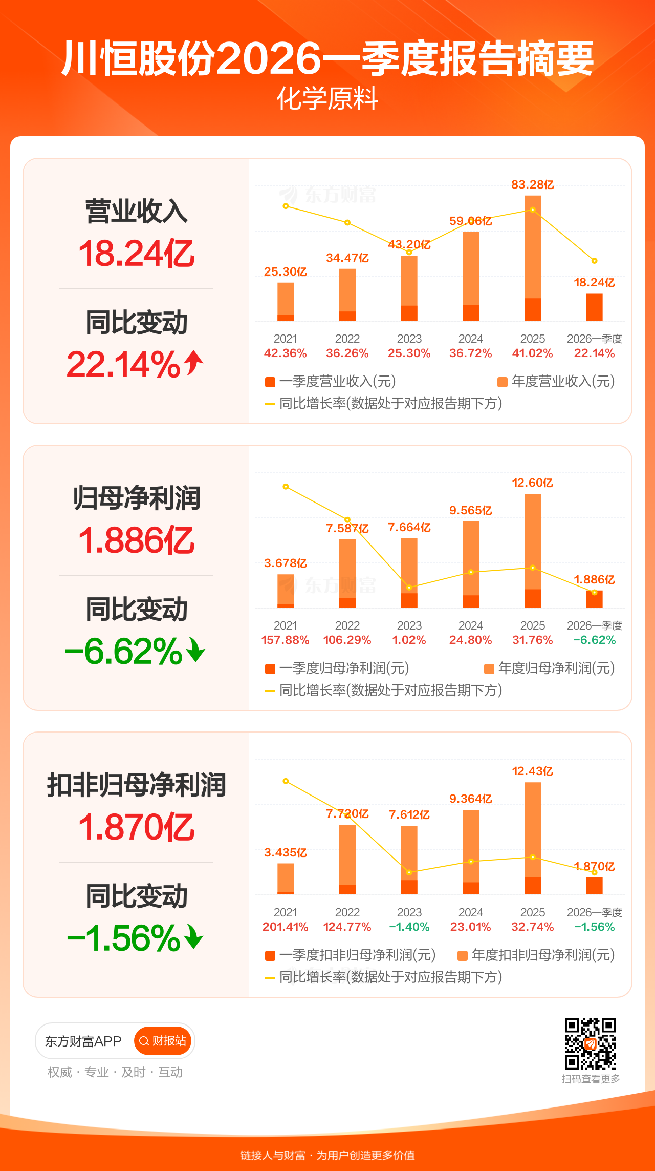川恒股份4月30日发布2026年一季报显示,公司一季度实现营业收入18.24亿元,同比增长22.14%;归母净利润1.89亿元,同比下滑6.62%;扣非归母净利润1.87亿元,同比下滑1.56%。