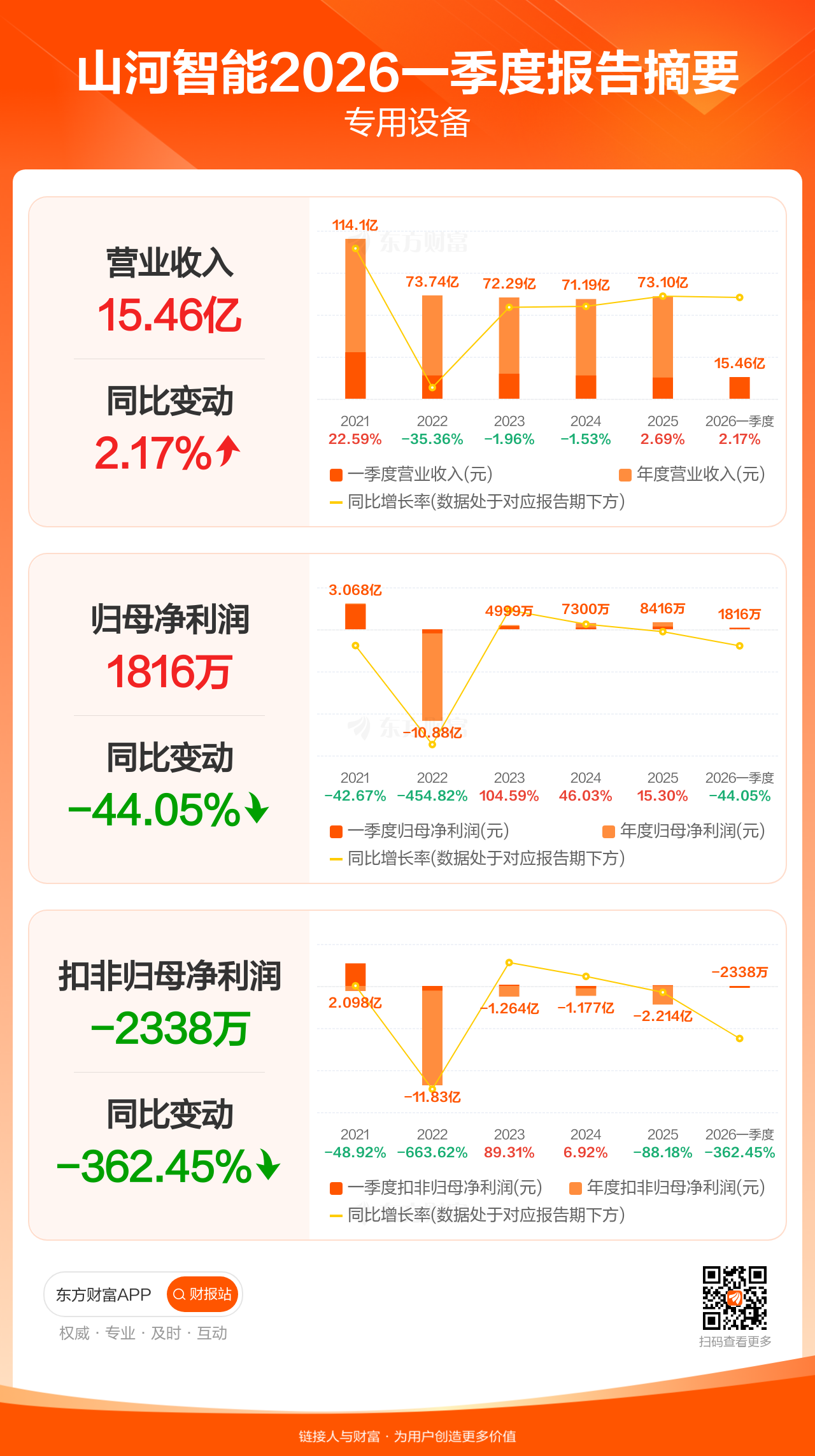 山河智能4月30日发布2026年一季报显示,公司一季度实现营业收入15.46亿元,同比增长2.17%;归母净利润1816.12万元,同比下滑44.05%;扣非归母净利润-2337.59万元。
