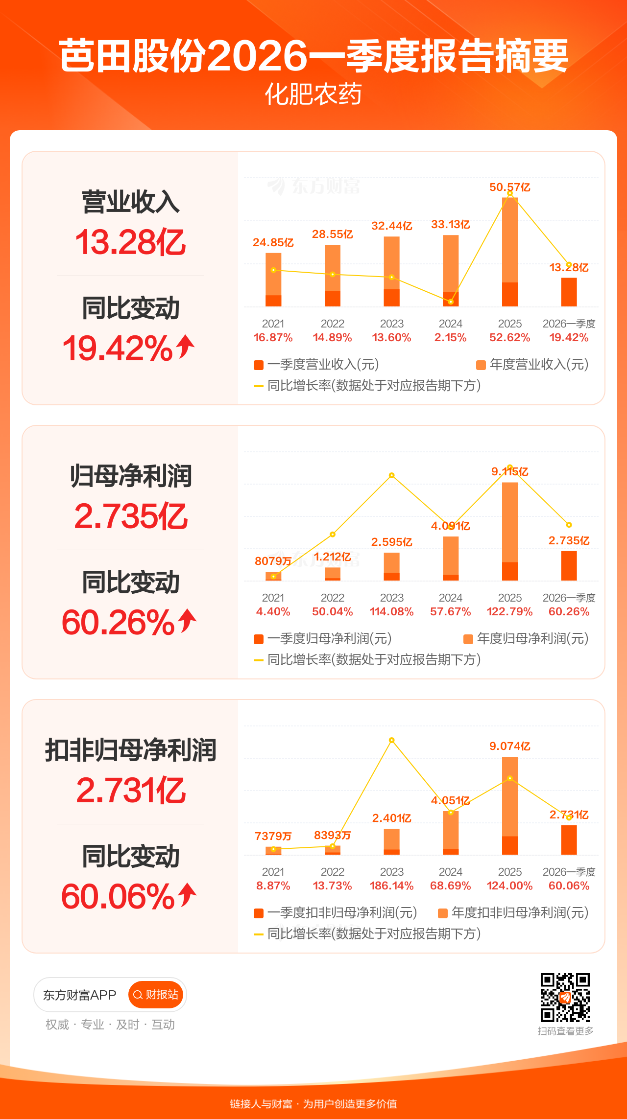 芭田股份4月30日发布2026年一季报显示,公司一季度实现营业收入13.28亿元,同比增长19.42%;归母净利润2.74亿元,同比增长60.26%;扣非归母净利润2.73亿元,同比增长60.06%。