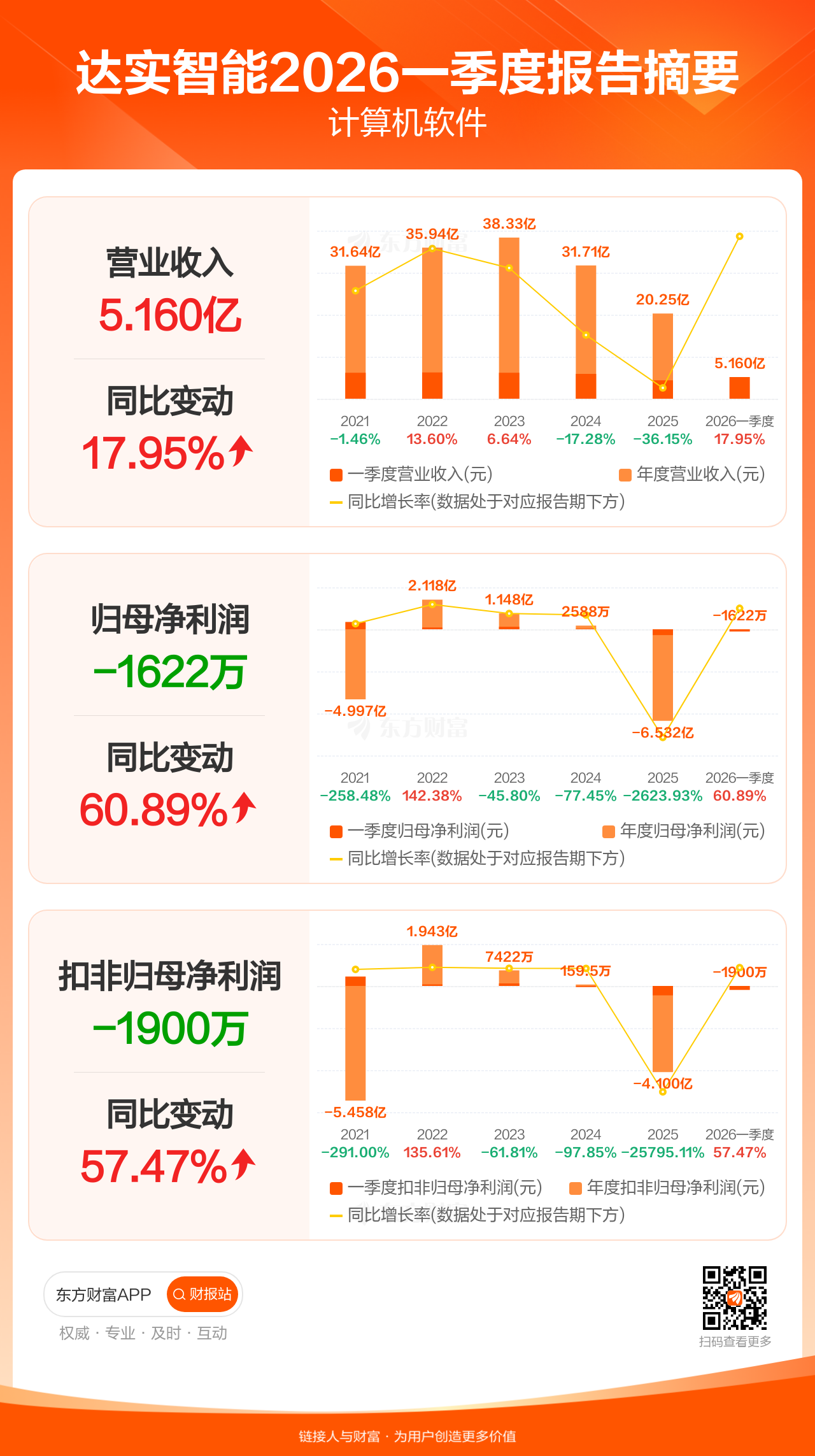 达实智能4月30日发布2026年一季报显示,公司一季度实现营业收入5.16亿元,同比增长17.95%;归母净利润-1622.20万元;扣非归母净利润-1900.37万元。